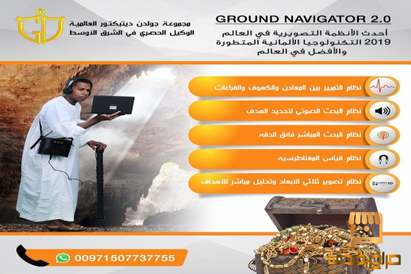 يستطيع المنقب اكتشاف وتحديد مواقع الكنوز الذهبية و الآثار المدفونة والتجاويف تحت الارض من مقابر وسراديب وانفاق ..الخ تقدم لكم شركة جولدن ديتكتور العالمية المستكشف الارضي معجزة العصر الحديث وافضل اصدار من شركة OKM الالمانية العريقة جهاز المستكشف الأرضي جراوند نافيجيتور الاقوى عالميا بدون منافس لجميع المنقبين والمستكشفين عن الذهب والكنوزوالمعادن والسراديب والفراغات والجهاز المعتمد من جميع بعثات وشركات التنقيب العالميه شركاء النجاح مع مصانع OKM الألمانيه. الضمان » 3 سنوات بلد الصناعة » المانيا الماركة » OKM الالمانية اعماق » تتجاوز 40 متر في باطن الارض مسافات امامية » 2000 متر يعمل الجهاز على برامج بحث مختلفة : برنامج كشف ( الذهب الدفين - الذهب الخام – الفضة- النحاس - الكهوف والفراغات – البلاتين- الحديد – الألماس- الاحجار الكريمة – البرونز ). • برنامج التصويرالمباشر ثلاثي الابعاد 3D VISUALIZER
