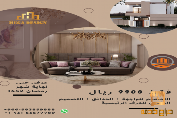 تتشرف شركة ميغا ديزاين بتقديم كافة خدمات التصميم الداخلي والخارجي للفلل والاستراحات والحدائق بجودة عاليه وباسعار منافسة