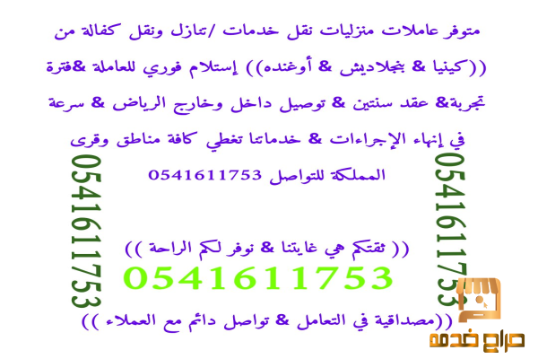 متوفر عاملات منزليات لنقل الخدمات يجيدو كافة أعمال المنزل من ( طبخ - غسيل - كي - تنظيف - رعاية كبار سن - رعاية أطفال - رعاية ذو الإحتياجات الخاصه ) من ((كينيا & بنجلاديش &اندونسيا & الصومال & أوغنده)) إستلام فوري للعاملة &فترة تجربة& عقد سنتين & توصيل داخل وخارج الرياض & سرعة في إنهاء الإجراءات & خدماتنا تغطي كافة مناطق المملكة للتواصل : 0541611753
