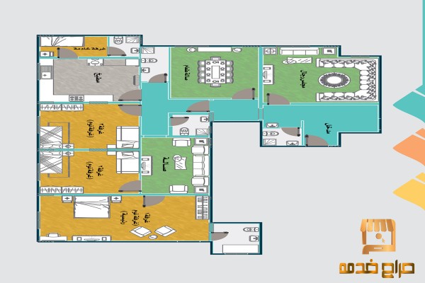 - مواصفات الشقة 5 غرف: مساحة 198.33 م (ملحق) – (3 غرف نوم + مجلس رجال + صالة طعام + صالة منزل + 5 دورات مياه + غرفة خادمة + مطبخ)