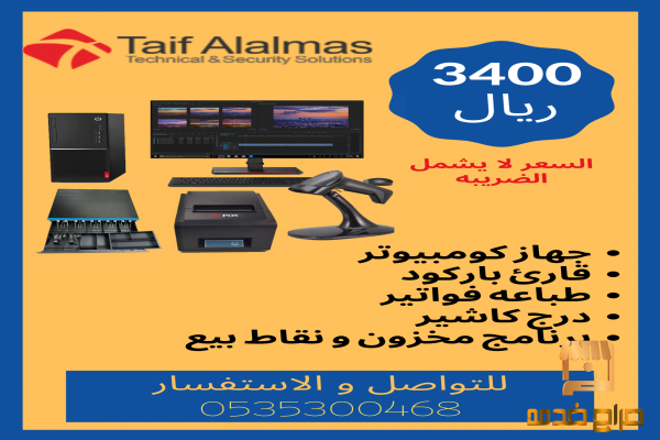 -جهاز حاسب الى اي كور ثري عالى الجودة -برنامج المخازن والمبيعات والمشتريات -درج الكاشير الالكترونى خمس فتحات - قارئ الباركود - طابعه الفواتير بسعر 3400 ريال غير شامل الضريبه