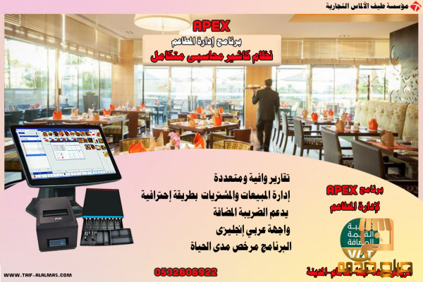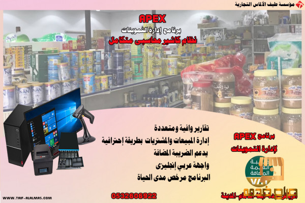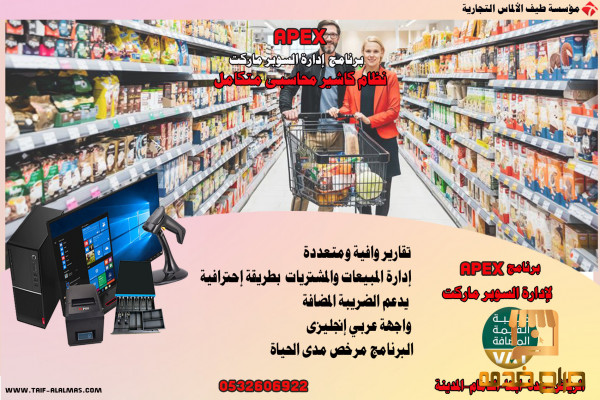 ●مميزات النظام المحاسبى apex store - اهم المميزات تتمثل فى ضبط ورقابة النقدية والمخزون الداخلى ومتابعة العملاء والمبيعات على حسب العميل وعلى حسب الصنف . - طباعة الباركود و دعم جميع اجهزه الاسكانر والطابعات . - يدعم الشاشات التاتش و متوافق مع ادراج النقدية بجميع انواعها . - سهل الاستخدام يمكن لاى شخص قادر على استخدام الحاسب الالى التعامل مع برنامج نقاط البيع - يوفر خاصية ادخال الاصناف بكامل تفاصيلها مع صورة لكل منتج - يسرع عمليات البيع باستخدام خاصية قارى الباركود للكود الملصق على المنتج . - استخراج تقارير مختلفة ودقيقة وامكانية التعديل على تلك التقارير . - يوفر خاصية التنبيهات بمواعيد السداد و يسهل ادارة حسابات البنوك - يدعم القيمة المضافة للنظام السعودى - ومميزات اخرى لا حصر لها....... مدخلات برنامج نقاط البيع: -ادخال اسماء وبيانات كل كاشير.مدخلات برنامج نقاط البيع -تحديد صلاحيات البيع الخاصة بكل كاشير. -ربط كل كاشير على المخزن. -متابعة الحركات اليومية لبرنامج نقاط البيع: -تسجيل البيع النقدى. -تسجيل البيع من خلال الفيزا. -تسجيل البيع عن طريق الدليفرى. -مراجعه اليومية الخاصة بالمخازن من صفحة المخازن. مخرجات برنامج نقاط البيع: -تقارير الكاشير. -عرض تقارير مبيعات كل كاشير والمبالغ المحصلة خلال فتره معينة. -تقرير عجز او فائض كل كاشير. احصائيات: - توضيح اكثر الاصناف حركة واكثر الاصناف ركود. - احصائيات بالاصناف المطلوب شرائها. - احصائيات بالاصناف التى يزيد رصيدها داخل المخزن عن الحد الاقصي.