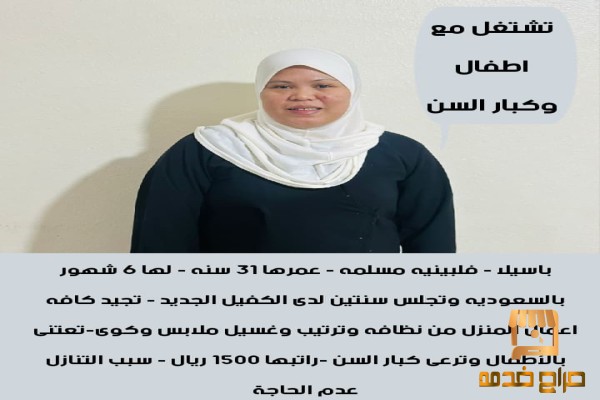 بنجلادش _ مسلمه _ 33 سنه _ سبق لها العمل سنتين بالاردن وسنتين بالسعوديه _ لها يومين في السعوديه _ تتكلم عربي كويس _ تساعد بالطبخ وتعرف بعض الأكلات السعوديه _ تجيد التعامل مع الاطفال _ تجيد التعامل مع كبار السن _ نظافه _ غسيل _ ترتيب _ ماعندها مشكله في أي شئ _ تشتغل سنتين عند الكفيل الجديد _ الراتب 1100 ريال
